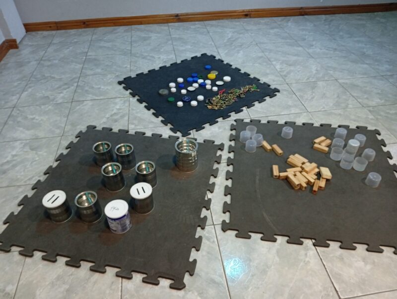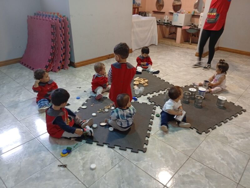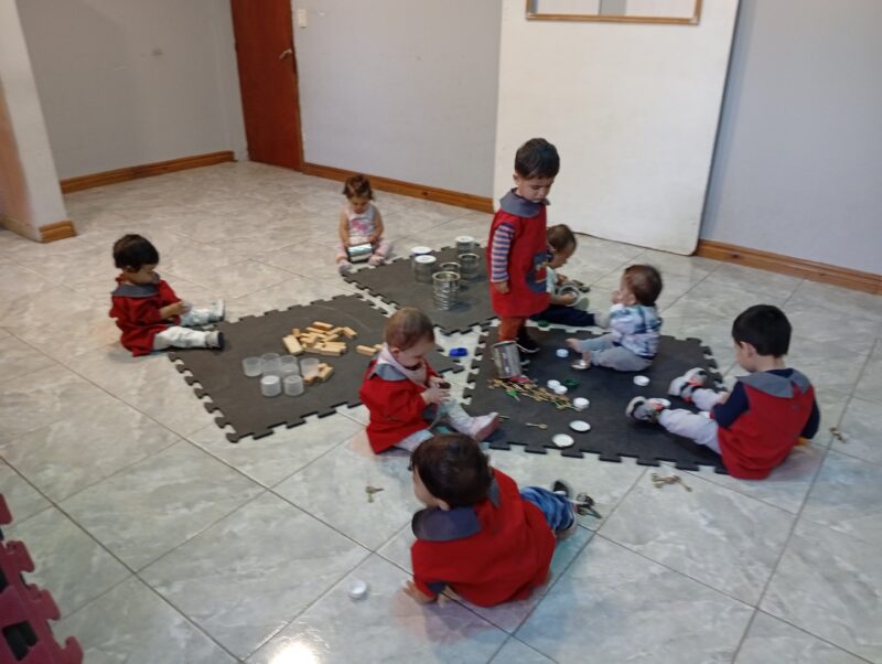 - I.D:”EXPLORAMOS,TOCAMOS Y EXPERIMENTAMOS”, preparamos la sala con diferentes elementos cómo latas, maderas, llaves y tapas de diferentes colores y tamaños para explorar libremente las posibilidades que estos materiales nos brindan.