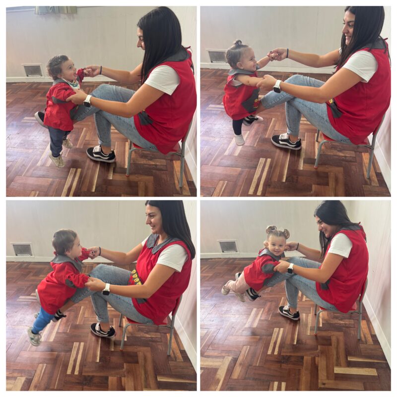 ID: “ JUEGOS DE CRIANZA”: Continuamos con los juegos de sostén. En esta oportunidad la docente sentada con una pierna sobra la otra meciendo a los niños sobre el empeine.